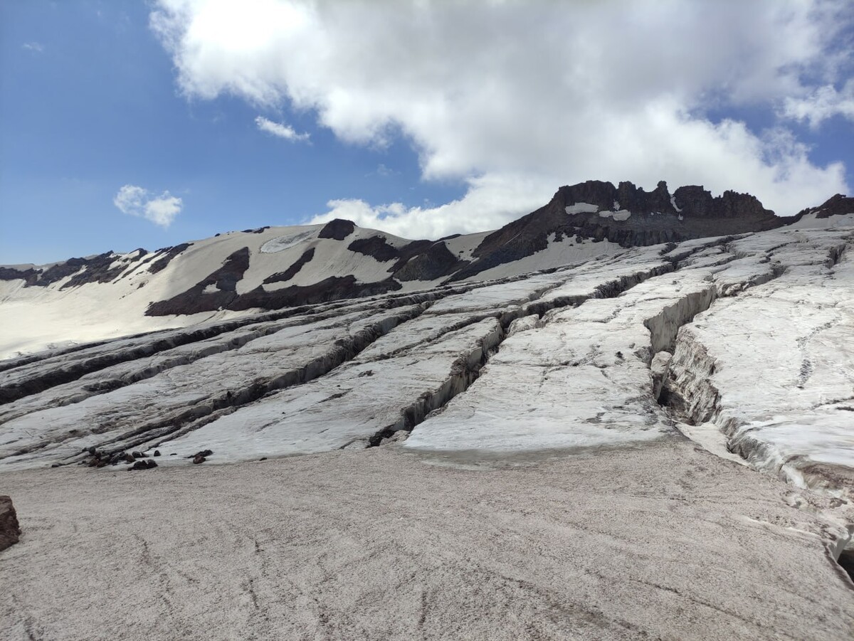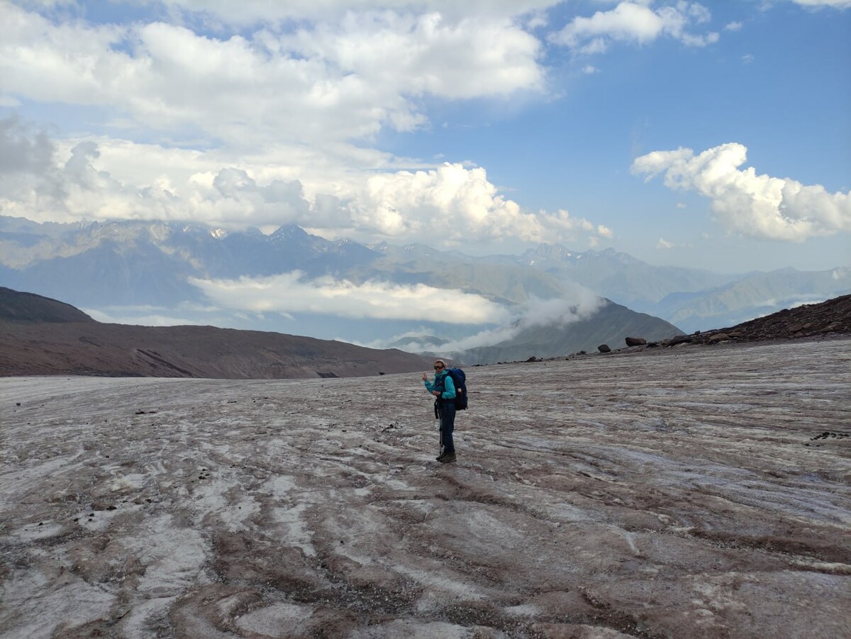 ледника Гергети. Пересекаем ледник. Здесь нам могут пригодиться кошки.