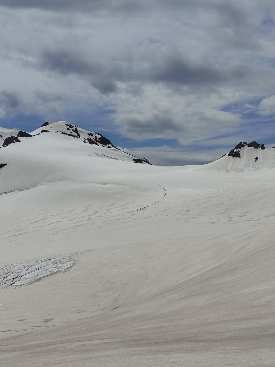 через каменистые и снежные склоны. Затем мы опять выходим на ледник