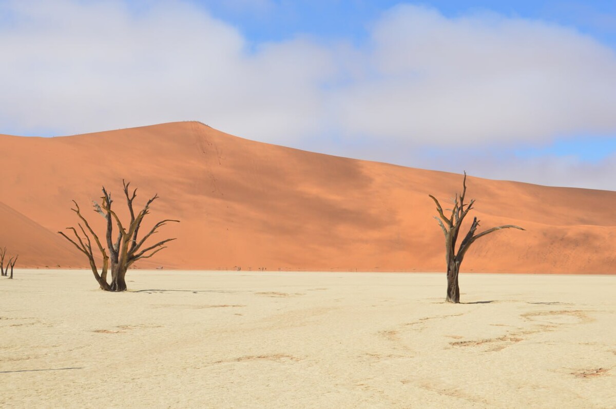 Затем, пока не так много туристов, поднимаемся на дюну Большой Папа. Подъём на вершину дюны способен пощекотать нервную систему, но опасности не представляет. Затем спускаемся к Мертвой Долине - одно из топовых мест Намибии, и одно самых любимых мест фотографов мира. Запечатлеваем фантастическую картину окаменевших деревьев, которые сохранились здесь после резкого изменения климата в течение нескольких сот лет благодаря сухому климату.