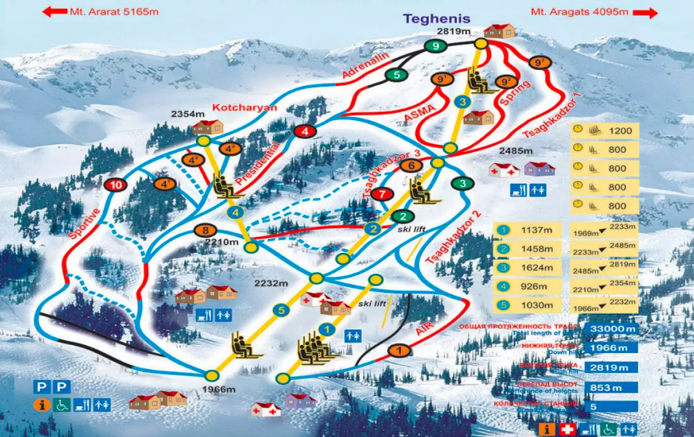 Просыпаемся, плотно завтракаем и выезжаем на популярный горнолыжный и климатический курорт Армении - Цахкадзор, расположенный в 50 км от Еревана в живописной долине на высоте 1800 метров над уровнем моря у подножья горы Тегенис, где и находятся самые разнообразные трассы для катания на горных лыжах, сноубордах и снегоходах. Размещаемся в гостинице, переодеваемся для активностей и едем пару километров до начала зоны катания, которая расположена между высотами 1966 и 2819 м и включает 15 трасс различных категорий сложности. Их общая протяженность 30 км, длиннейшая тянется почти на 8 км. На самом верху — черные и красные трассы для опытных горнолыжников и сноубордистов и целина для фрирайдеров. В средней части склона расположены синие трассы, есть зеленая для новичков. Серпантин с крутыми и резкими поворотами на нижнем участке к северу от подъемников — только для искушенных горнолыжников. Гордость Цахкадзора — современная канатная дорога фирмы LEITNER, включающая три последовательных подъемника общей протяженностью 4200 м. Чтобы подняться с нижнего уровня на самый верх, потребуется всего 40 минут. Кроме канатки, в зоне катания есть еще две канатные дороги и несколько бугельных подъемников.
