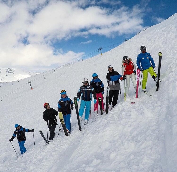 Делимся на группы по уровню катания и начинаем обучение на склоне.