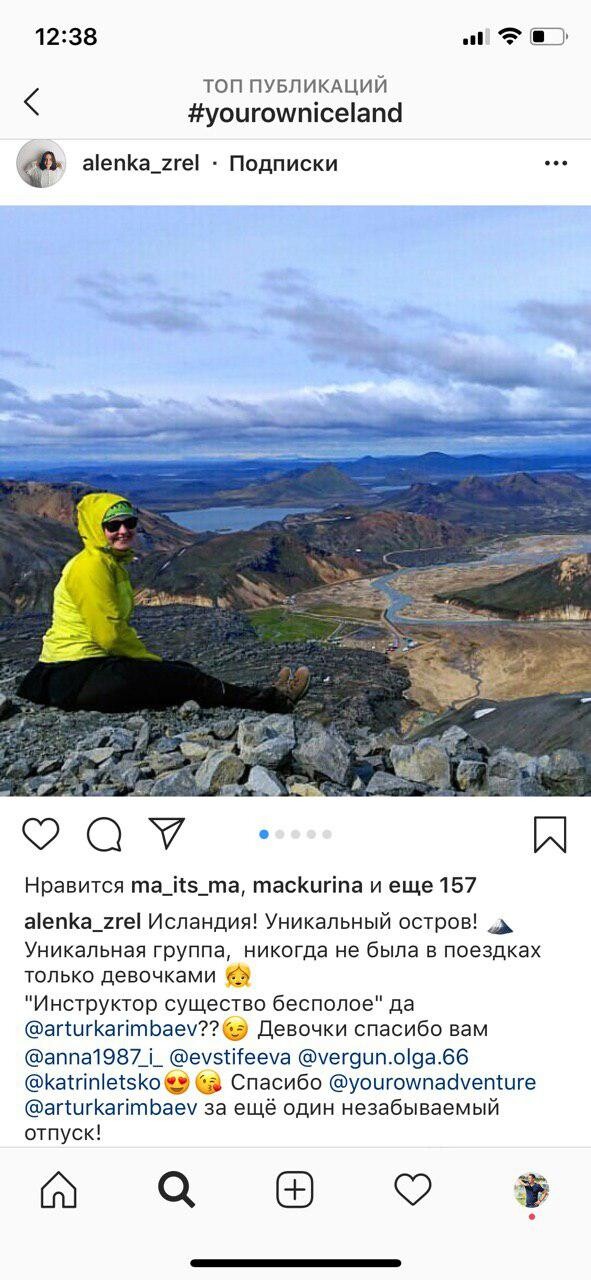 Исландия прекрасна! Как будто побывала в другом мире. Это сказка, где заряжаешься энергией Земли и Солнца. Тур в целом очень крутой. Проходишь маршрут Laugavegur, входящий в Топ-10 самых красивых и привлекательных маршрутов мира. Мы посмотрели цветные горы, фумаролы, гейзеры, водопады в национальном парке Скогар, черные пески, вулканы. По сложности - средне, начинать походную жизнь с этого тура не стоит, всё-таки не для новичков. Ноги хорошо бы подготовить к сильной нагрузке (частые крутые подъемы в гору с рюкзаком за плечами). Из минусов - немного затянуто (2 дня в Рейкьявике перед началом и 2 после) ; к списку снаряжения хорошо бы добавить гамаши для снежных переходов. Итого - крепкая четверка и огромная благодарность команде Your Own Adventure за отлично проведенный отпуск, впечатления и неповторимые эмоции!