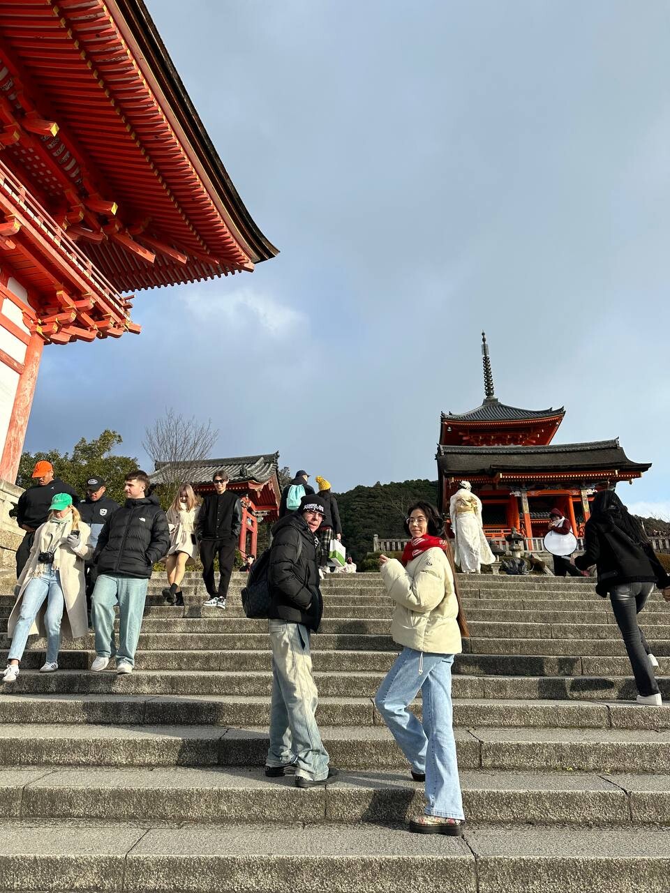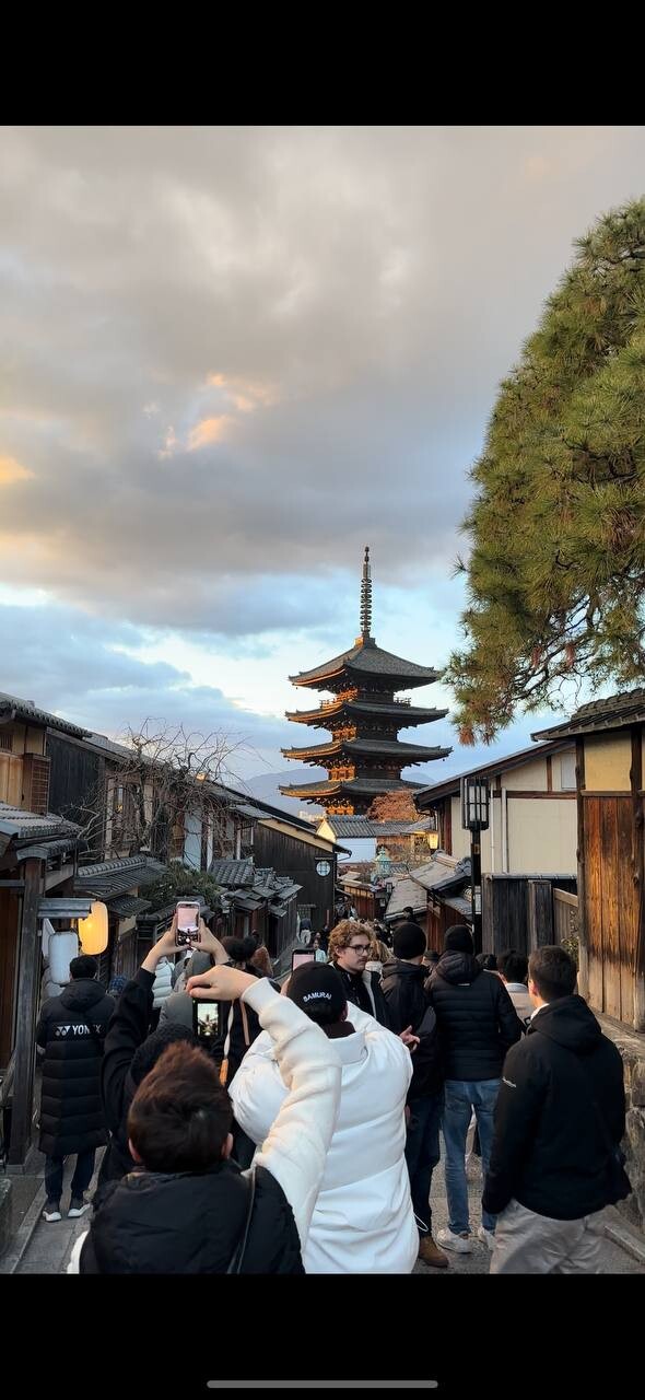 К обеду возвращаемся в отель, собираем вещи и садимся на поезд-пулю синкасэн, который со скоростью 300 км/ч везет нас 1,5 часа с панорамой на заснеженную Фудзияму до города Киото. С 794 по 1869 год Киото был столицей Японии, главной резиденцией Императоров, поэтому он стал хранилищем лучших достижений японского искусства, культуры и религии. "Долетев" до центра Киото, размещаемся в отеле в традиционном японском стиле. Рёкан представляет собой небольшой отель специфической формы с характерно изогнутой крышей. Внутри большой холл с полотнами каной (японская слоговая азбука) или иероглифами. Номера же имеют традиционный вид — пол выстлан татами, а двери представляют собой сёдзи. Но главной особенностью является то, что в рёканах принято спать не на кроватях, а на специальных матрацах, которые постелены на полу и отсутствует ванная комната, постояльцы пользуются общей баней — офуро — по очереди. Разместившись в необычном отеле, отправляемся на непродолжительную прогулку по вечернему Киото.