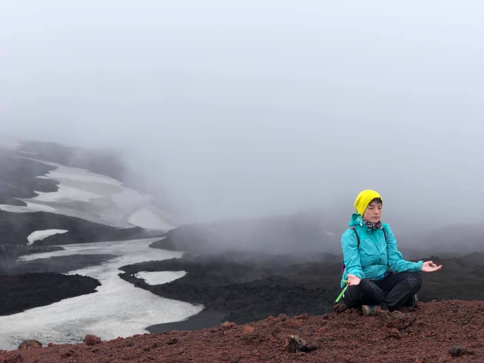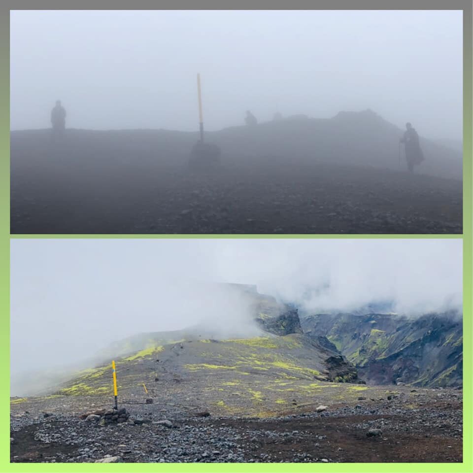 Против предыдущих радиальных выходов, решила всё-таки пойти с трекинговыми палками, и - о боги - как это было правильно. Пока поднимались, много раз задумывалась, а смогли бы мы пройти этот же путь с рюкзаками... Ну, пожалуй, смогли бы, но шли бы часа на 3 больше (как минимум). Последние 5 км шли 2 часа, всё в гору, в абсолютном, почти непроглядном облаке. Видно было метров на 20 вперёд, по бокам - сплошное молоко. И вот, наконец, мы добрались, но не до самого Эйяфьядлайёкюдля (на него нельзя), а до соседних с ним вершин: Магни и Моди. Стоило нам преодолеть последние метры, как сквозь дымку показалось солнце, туман чуть-чуть расступился и мы... не увидели Эйяфьядлайёкюдль, только саааамый его краешек.))) но и этого было довольно. По дороге назад мы будто шли новой тропой: облако совсем рассеялось и выяснилось, что весь подъём мы шли мимо ошеломительных пейзажей.