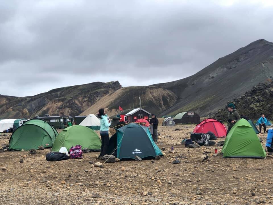 По плану мы должны были дойти до горного кемпинга с непроизносимым названием Храфтиннускер (в народе просто Снуки), среди снега и лавового песка. Дойдя до места, внезапно поняли: ночевать тут нельзя. Нет, кемпинг был замечательный, и с такой красотой вокруг, но - нас накрыл собачий холод. Несмотря на то, что по пути мы не особо мёрзли, в Снуки все дружно полезли за дополнительными кофтами, и всё равно конструктор термуха-флиска-куртка-шапка спасал как-то слабо. И приняли мы коллективное решение: пообедать и... пройти ещё 12 км, чтоб спуститься к ночёвке следующего (по программе) дня, озеру Алфаватн. Мозг сказал «Ааа!», организм сказал «ну ок».