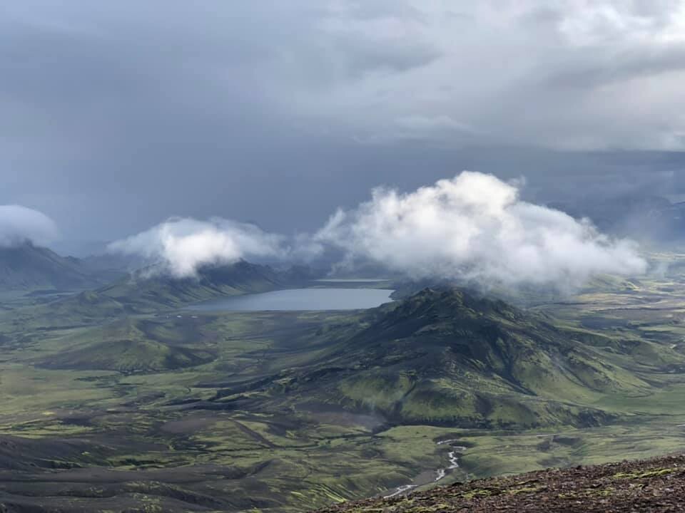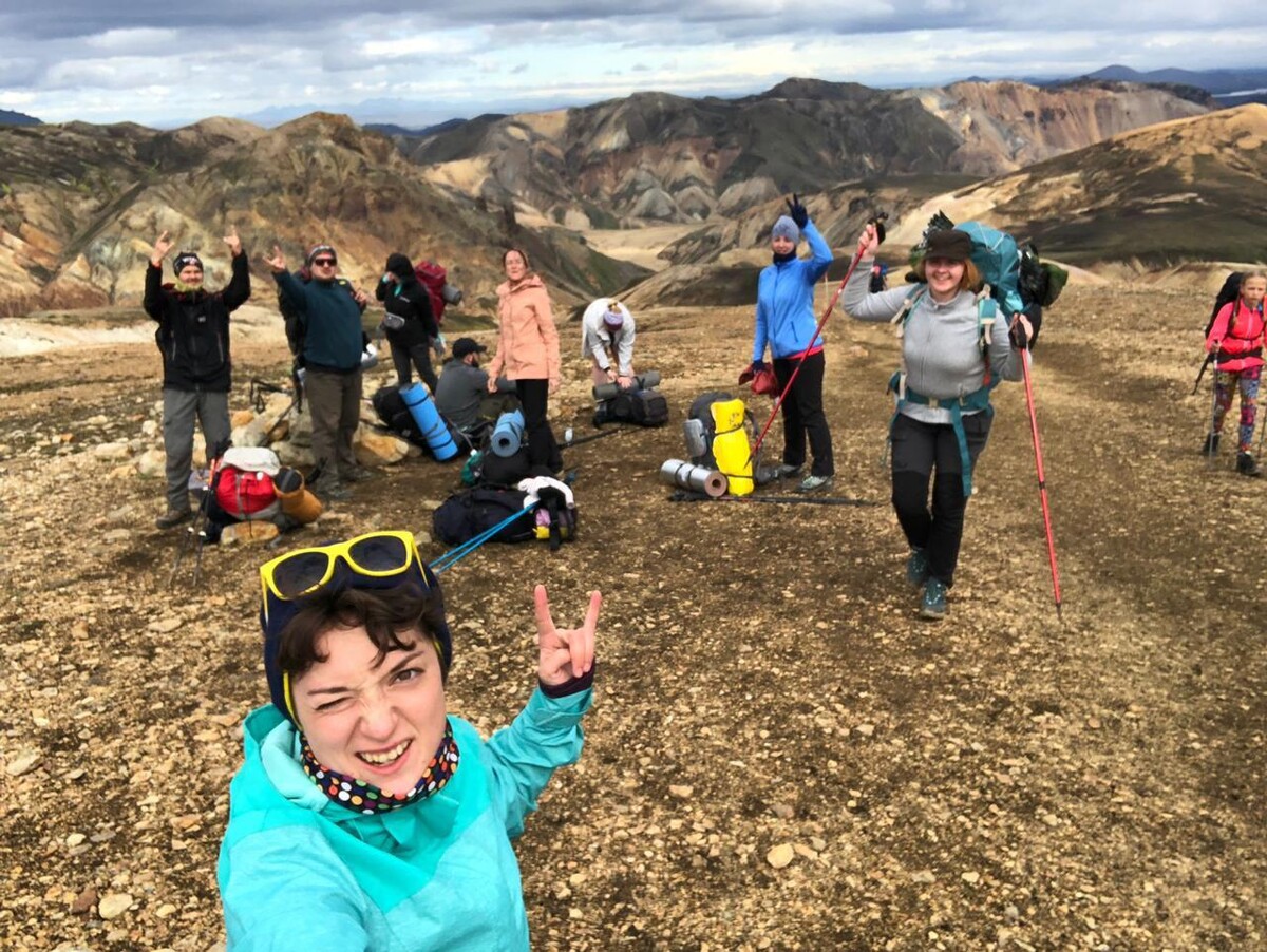 Переночевав в Рейкьявике, сели на автобус и поехали в место, откуда на следующий день начинался наш пеший маршрут: в долину Ландманналаугар. Главная достопримечательность этого места - риолитовые горы, ещё их называют радужными из-за огромной цветовой палитры, от иссиня-чёрного до ядрёно-зеленого. Поставили палатки, пообедали и налегке двинулись к горе Блахнукур, в качестве адаптационного радиального выхода. По дороге пересекли кусочек огромного лавового поля, которое, как мне подсказала Википедия, образовалось в результате извержения вулкана в 1477 (!!!) году. Пока шли, организм начал вспоминать, каково это - фигачить по горам без особенной физподготовки. Мозг сразу начал задавать дурацкие вопросы: а ты уверена? А фиг ли ты так собрала рюкзак, что он у тебя весит 17 кг, учитывая общую распределённую на всех участников еду? Как ты собираешься идти дохрена км в день, никогда раньше не ходив с (таким!) рюкзаком? А ты вообще готова? А как ты... - и тут мы дошли до вершины Блахнукура и мозг заткнулся. Панорама открылась просто невозможная. А уж когда я включила в колонке песню «Space oddity» Боуи (реверанс фильму «Невероятная жизнь Уолтера Митти») на фоне всей этой красоты - стало совсем волшебно.