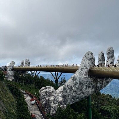 После подкрепления наших сил, мы спустимся в фуникулере к жемчужине Ба На Хиллс: Золотой мост "Руки Бога" — главный символ комплекса, открытый в 2018 году. Длина моста — 150 метров, он как будто поддерживается двумя огромными руками.